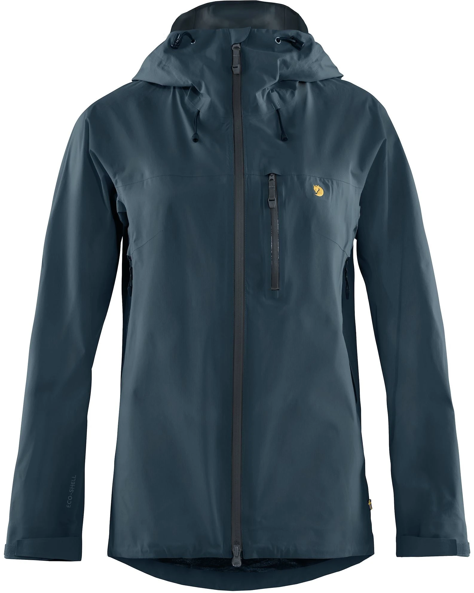Elastisk og ventilerende trelags Eco-Shell beskytter mot vind og vann, og er lett å komprimere i en ryggsekk. Stoff laget av resirkulert polyester med PFC-fri impregnering.