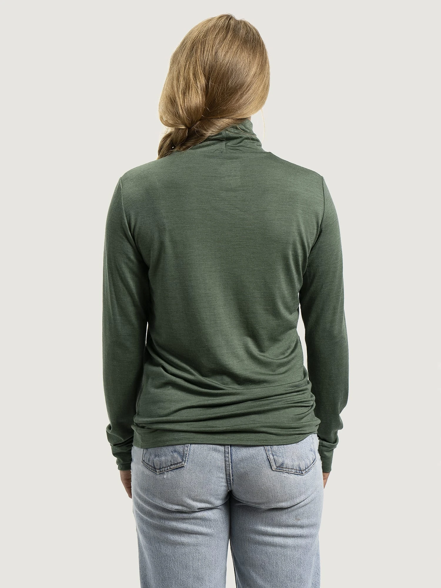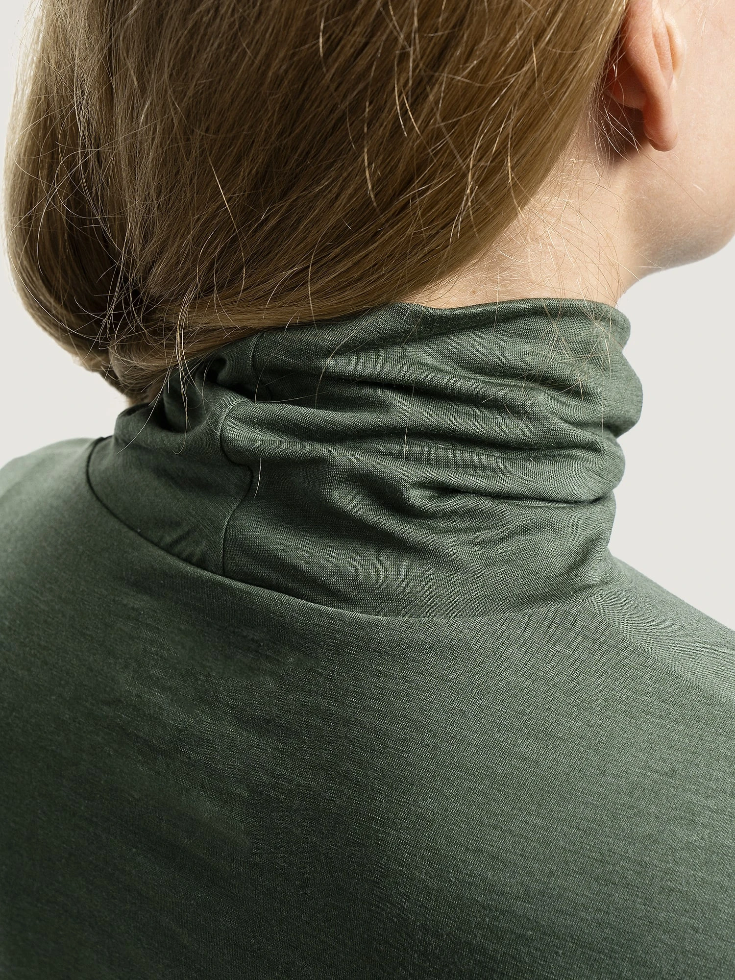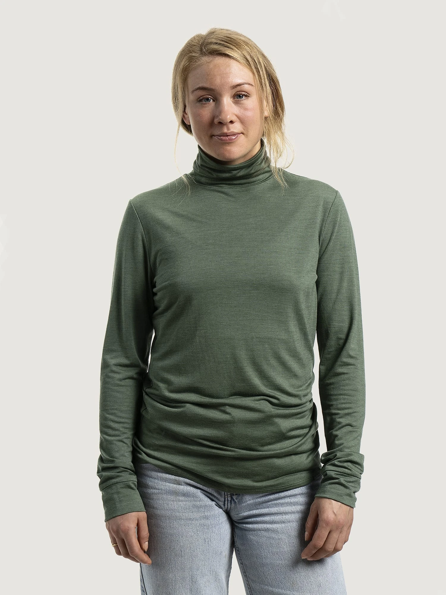 Lett, høyhalset genser i økologisk ull og silke.