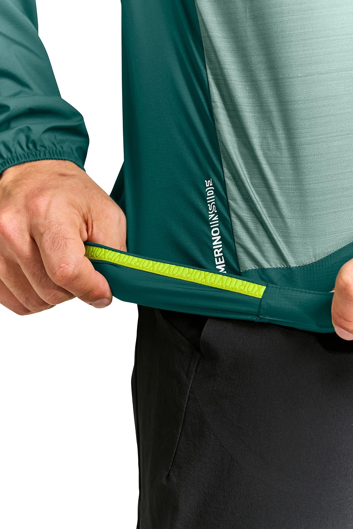 Det spesielle ved denne lette vindjakken er en unik materialblanding som inneholder 55% merinoullfibre, som er temperatur- og fuktighetsregulerende og behagelig mot huden.